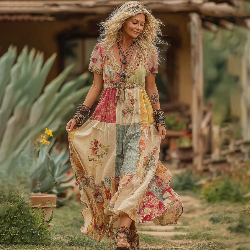 Classy Boho Patchwork Floral Embroidered Linen Maxi Dress