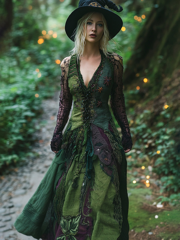 Halloween Themed Patchwork Embroidered Witch Tank Maxi Dress