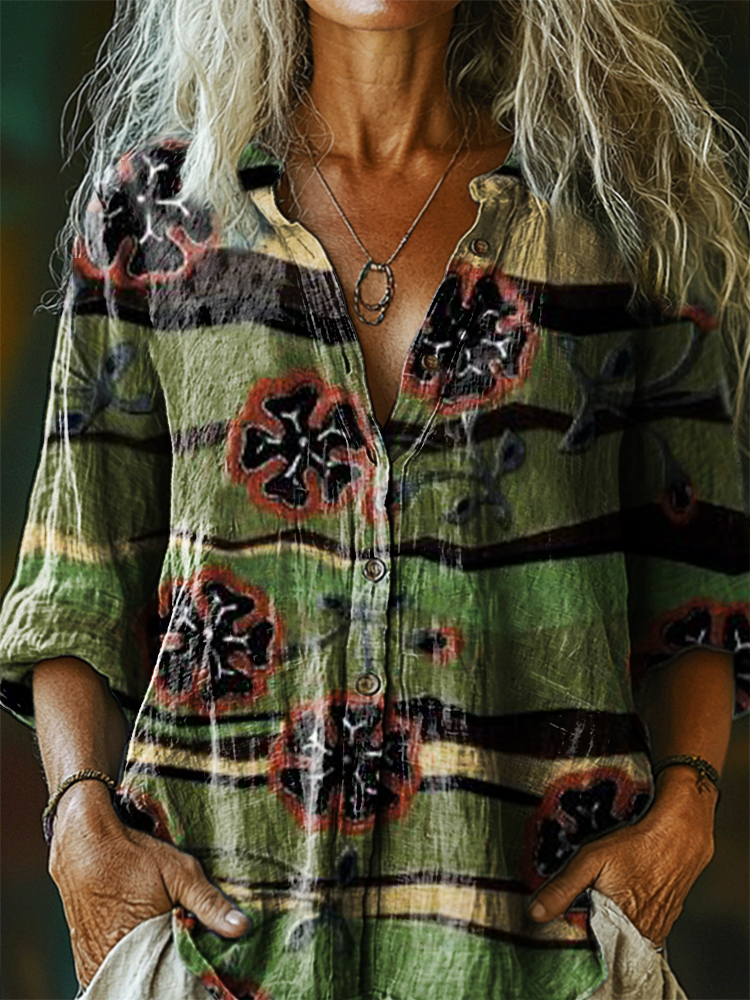 Women's Bohemian Floral Art Print Casual Cotton Linen Shirt