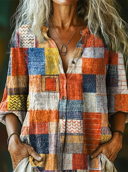 Women's Colorful Geometric Collage Art Print Casual Cotton Linen Shirt