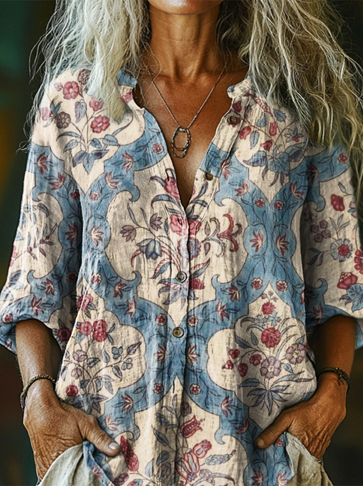 Women's Ethnic Floral Print Linen Cotton V-neck Casual Shirt