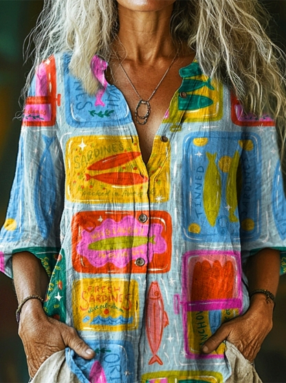 Women's Fun Ocean Fish Art Print Casual Cotton Linen Shirt