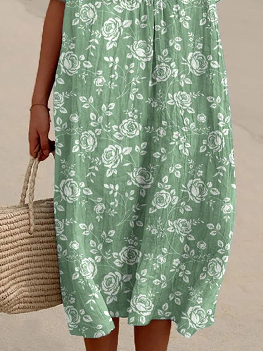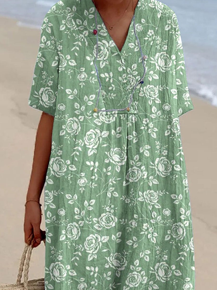 Women's Resort Style Rose Pattern Cotton And Linen V-Neck Dress