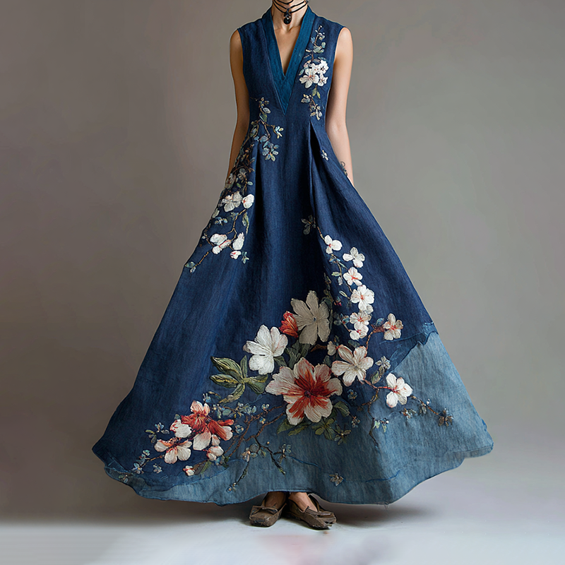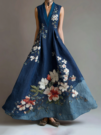 Women's Retro Japanese Sakura Art Stitching Casual Linen Dress