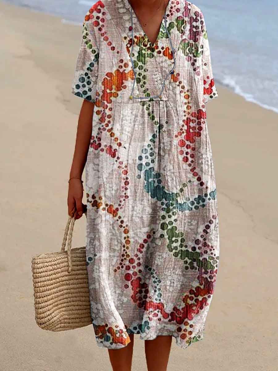 Women's Seaside Vacation Elegant Floral Pattern V-Neck Cotton and Linen Dress