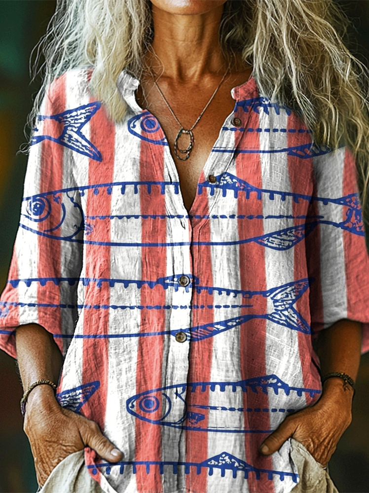 Women's Striped Fish Art Print Casual Cotton Linen Shirt
