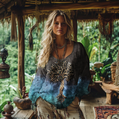 Women's Viking Celtic Knot Style Tree Of Life Rainbow Art Linen Casual T-shirt