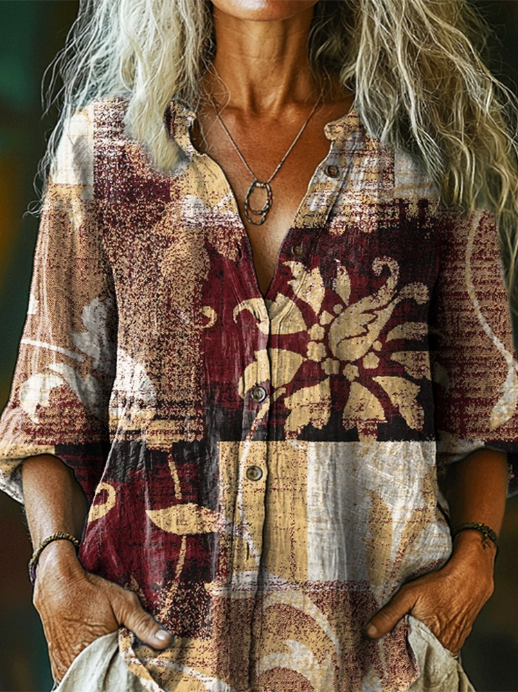 Women's Vintage Ethnic Collage Totem Flower Art Print Casual Cotton Linen Shirt