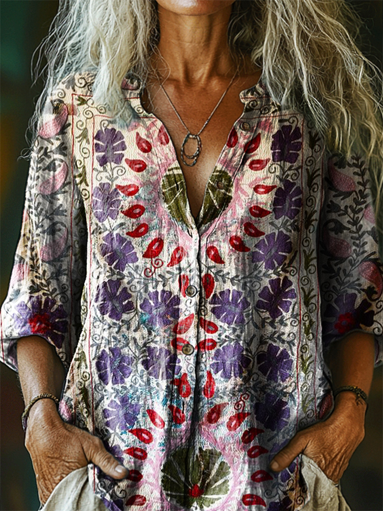 Women's Vintage Ethnic Floral Art Print Casual Cotton Linen Shirt