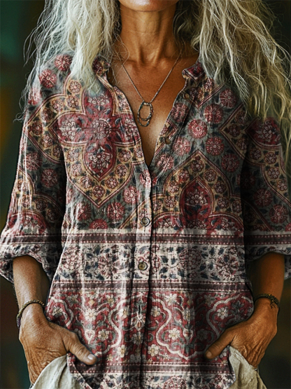Women's Vintage Ethnic Floral Art Print Casual Cotton Linen Shirt