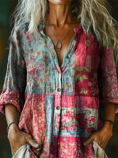 Women's Vintage Floral Art Print Casual Cotton Linen Shirt