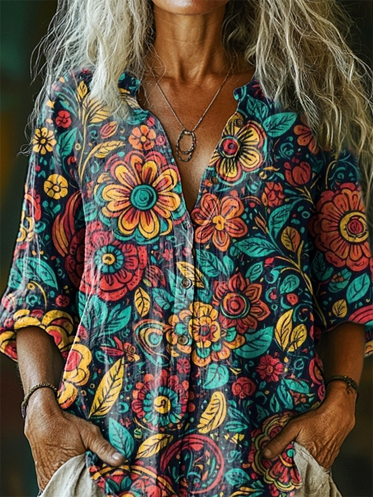 Women's Vintage Floral Art Print Casual Cotton Linen Shirt