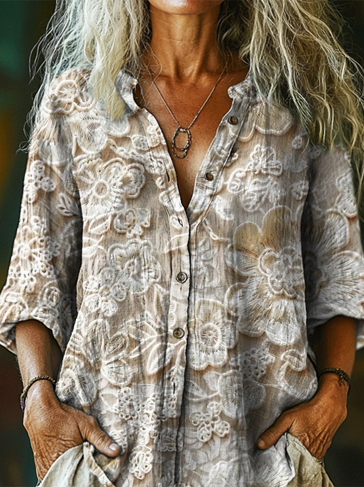 Women's Vintage Floral Textured Art Print Casual Cotton Linen Shirt