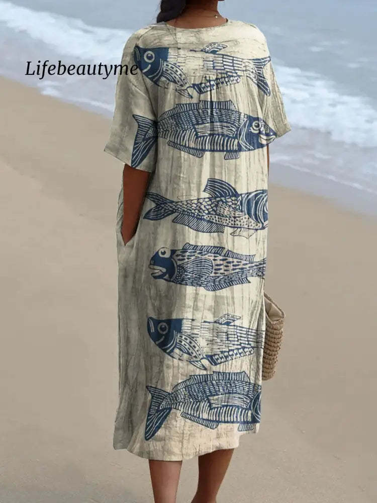 Women's Vintage Lovely Fish Art Print Flowy Dress