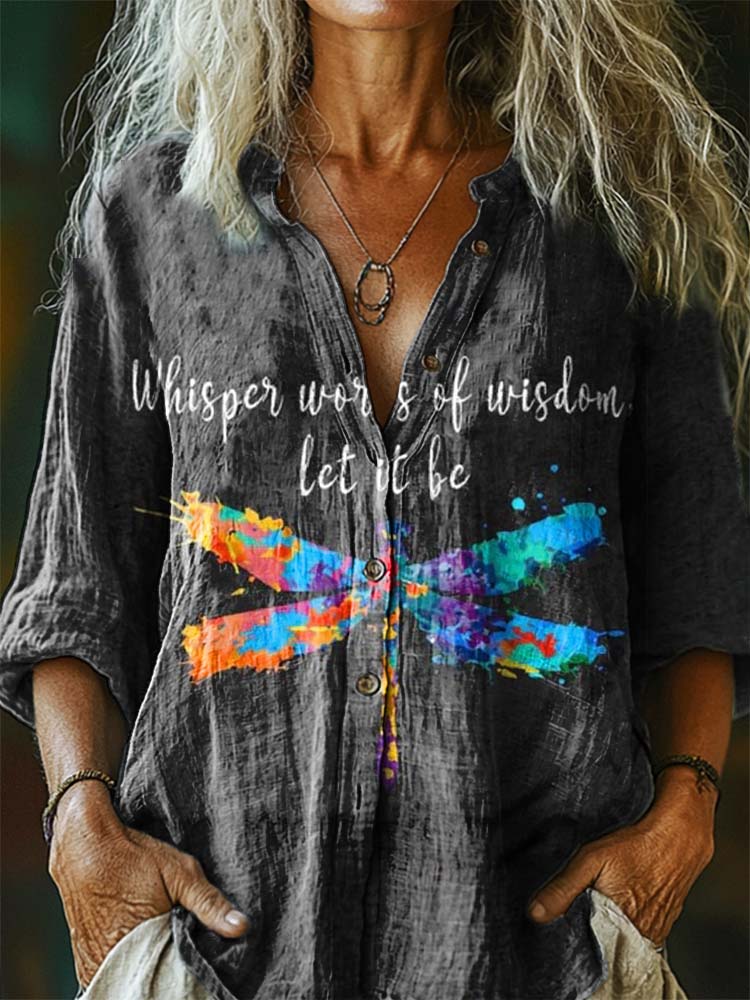 Women's Wisdom Whisper Dragonfly Pattern Art Print Linen Cotton V-Neck Casual Shirt