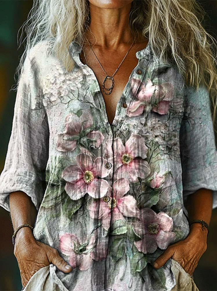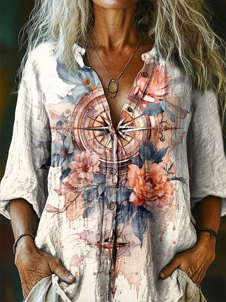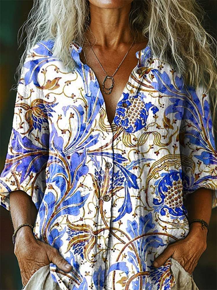 Women's Vintage Floral Art Print Casual Cotton And Linen Shirt