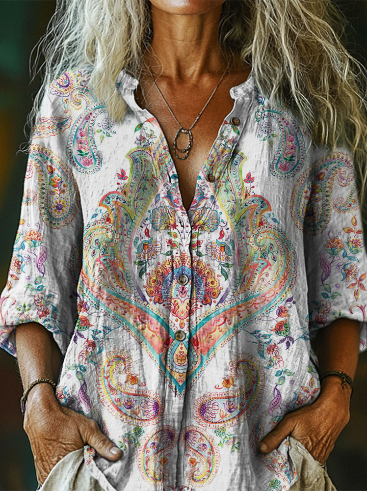 Women's Ethnic Style Pattern Art Printed Cotton and Linen Casual Shirt