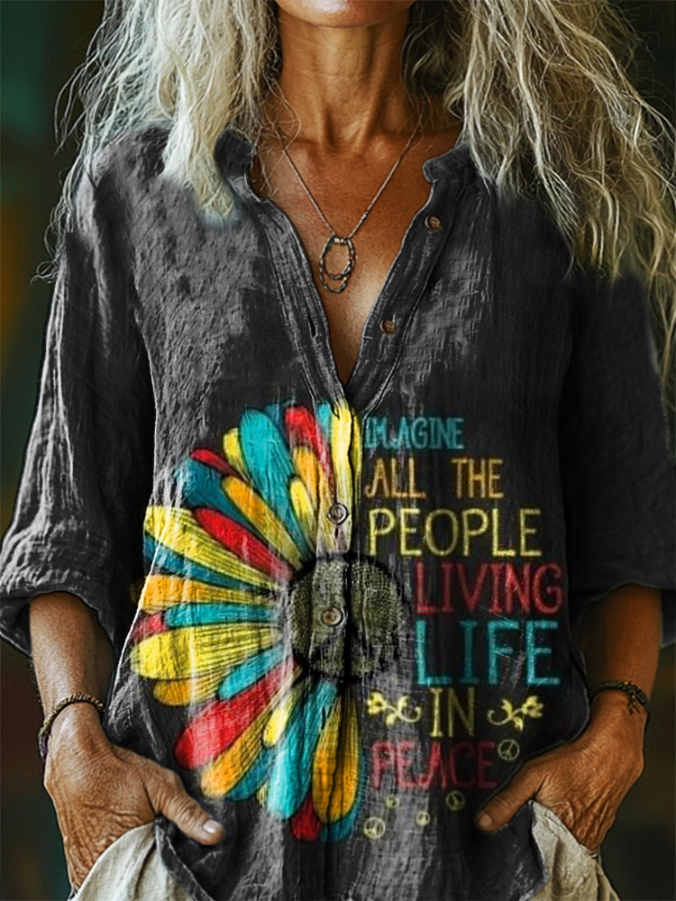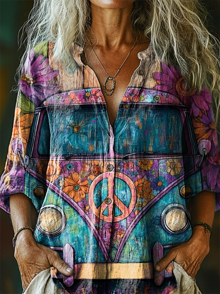 Women's Hippie Peace Music Art Print Casual Cotton And Linen Shirt