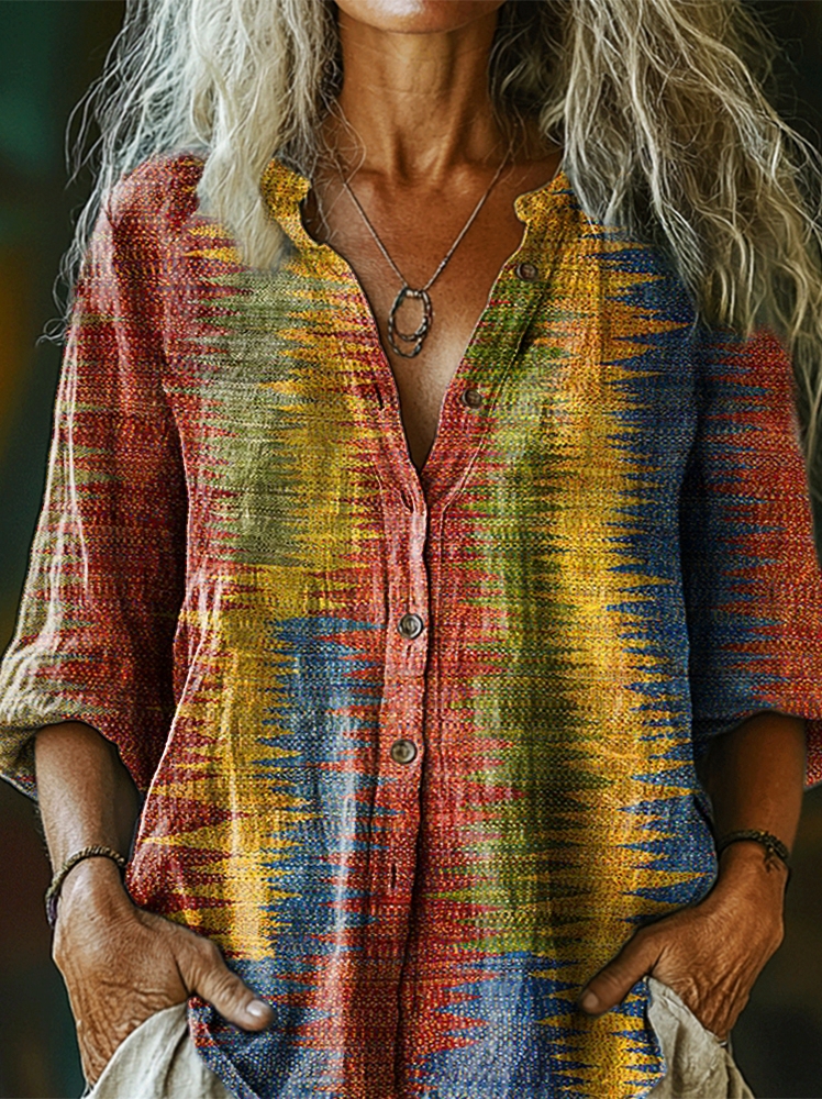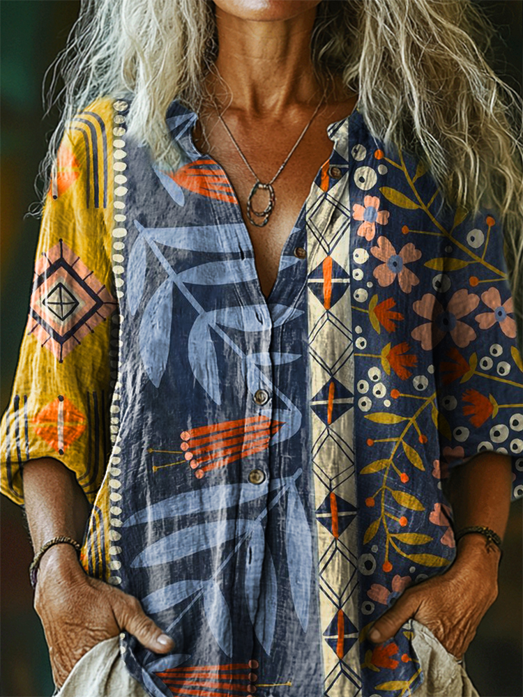 Women's Vintage Geometric Art Print Casual Cotton Linen Shirt