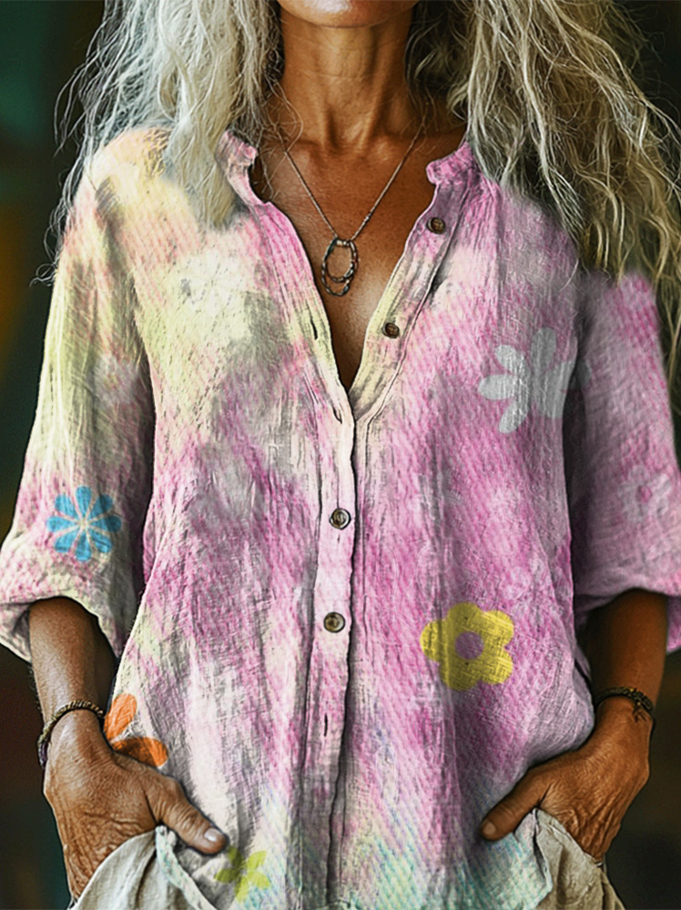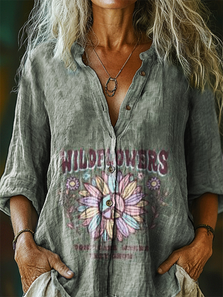 Women's Hippie Wildflower Art Print Casual Cotton And Linen Shirt