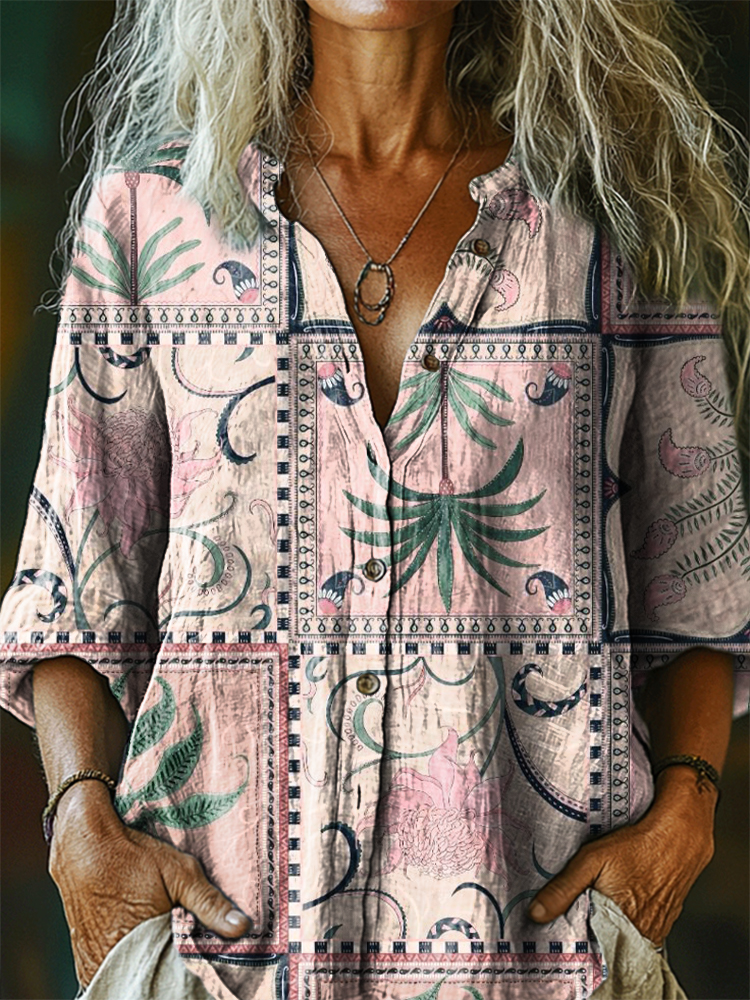 Women's Vintage Folk Floral Art Print Casual Cotton Linen Shirt