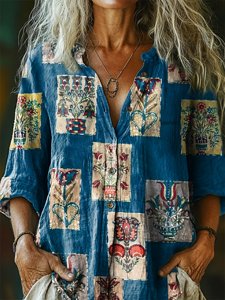 Women's Floral Patchwork Art Print Casual Cotton Linen Shirt