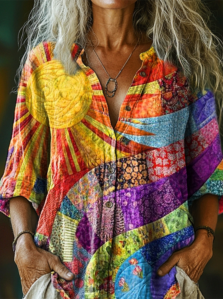 Women's Colorful Sun Floral Collage Print Casual Cotton And Linen Shirt