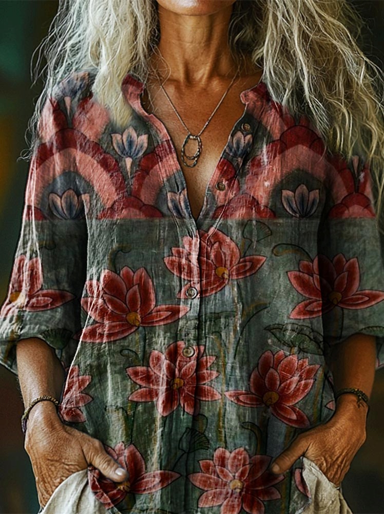 Women's Lotus Pattern Art Print Cotton and Linen Casual Shirt