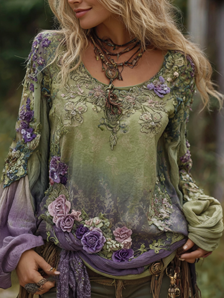 Vintage Purple Lavender And Floral Embroidered Linen Long Sleeve Shirt