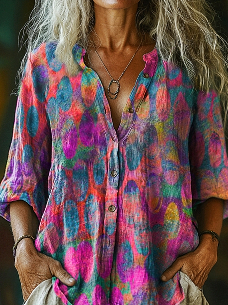 Women's Abstract Floral Pattern Print Casual Cotton And Linen Shirt