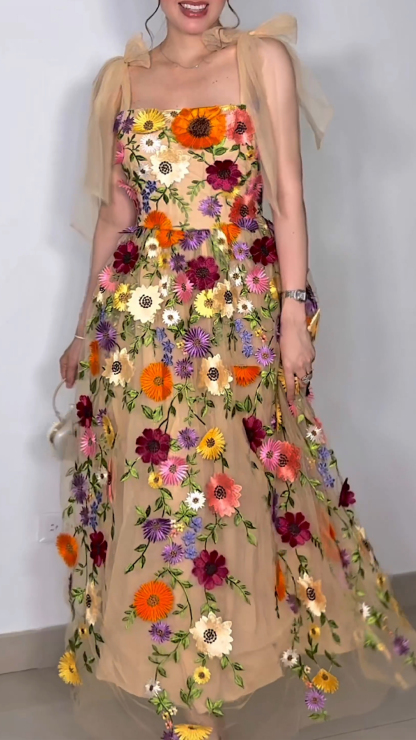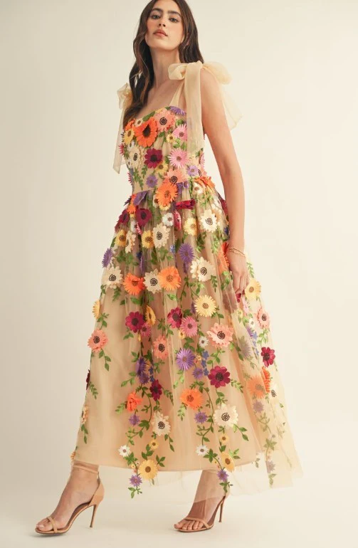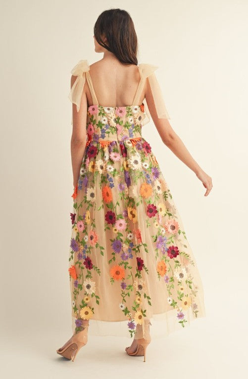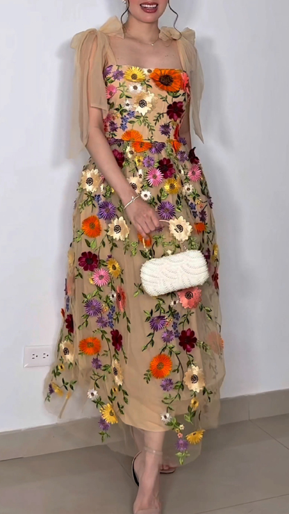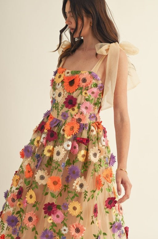 3d Floral All Over Shoulder Tie Midi Dress