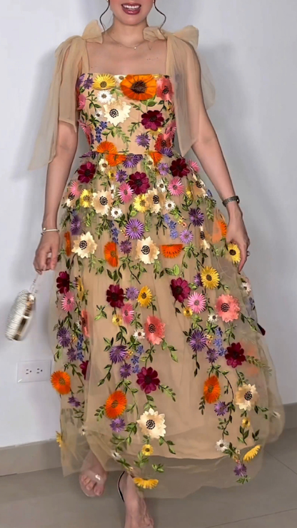 Women's Bare Toe Floral Long Dress 3D Floral Netted Long Dress Embroidered Transparent Lace Slimming Long Dress GZ0926