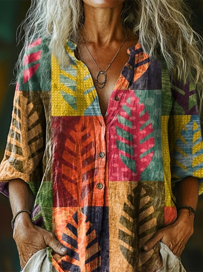 Women's Colorful Leaf Geometric Collage Art Print Comfortable Long Sleeve Cotton Shirt