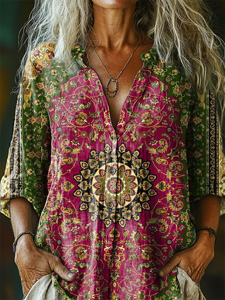 Women's Ethnic Style Tattoo Pattern Art Print Casual Cotton Linen Shirt