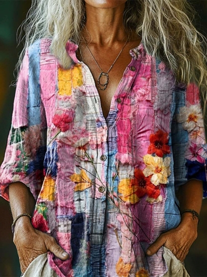 Women's Floral Patchwork Art Print Casual Cotton Linen Shirt