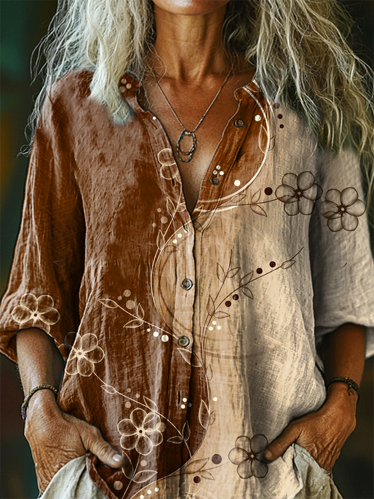 Women's Floral Pattern Art Print Casual Cotton Linen Shirt