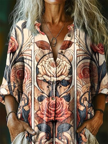 Women's Floral Pattern Art Print Casual Cotton Linen Shirt