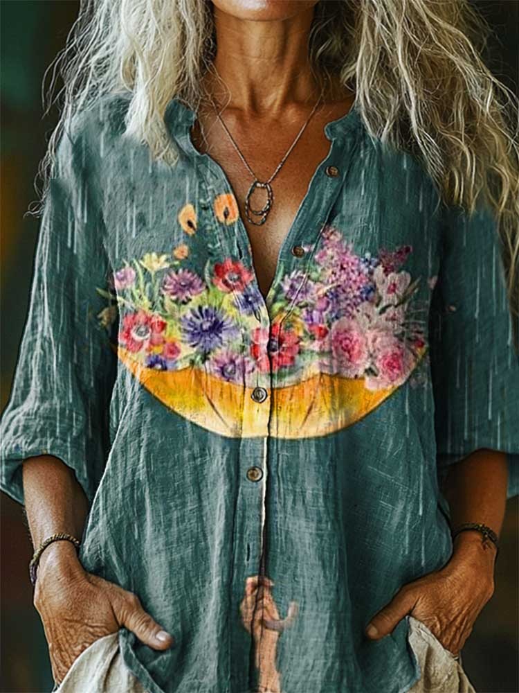 Women's Floral Pattern Art Print Cotton Linen Casual Shirt
