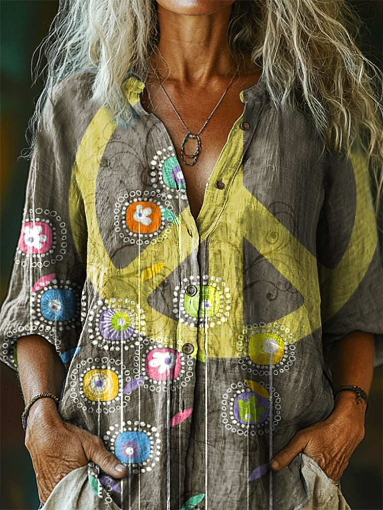 Women's Hippie Flower Art Print Casual Cotton And Linen Shirt