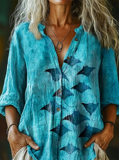 Women's Manta Rays Print Casual Cotton Linen Shirt