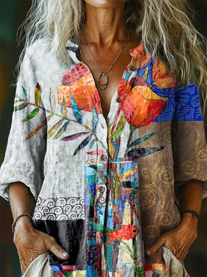 Women's Vase Floral Colorblocking Pattern Art Print Cotton Linen Casual Shirt
