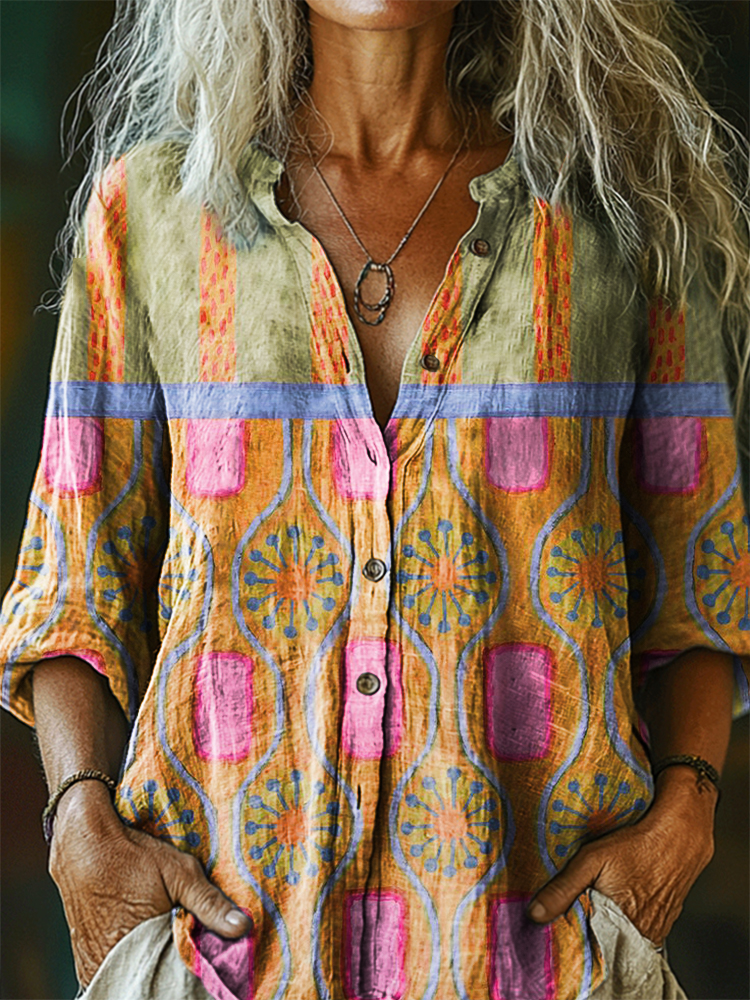 Women's Vintage Ethnic Floral Art Print Casual Cotton And Linen Shirt