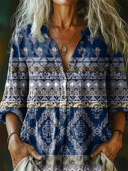 Women's Vintage Ethnic Floral Art Print Casual Cotton Linen Shirt