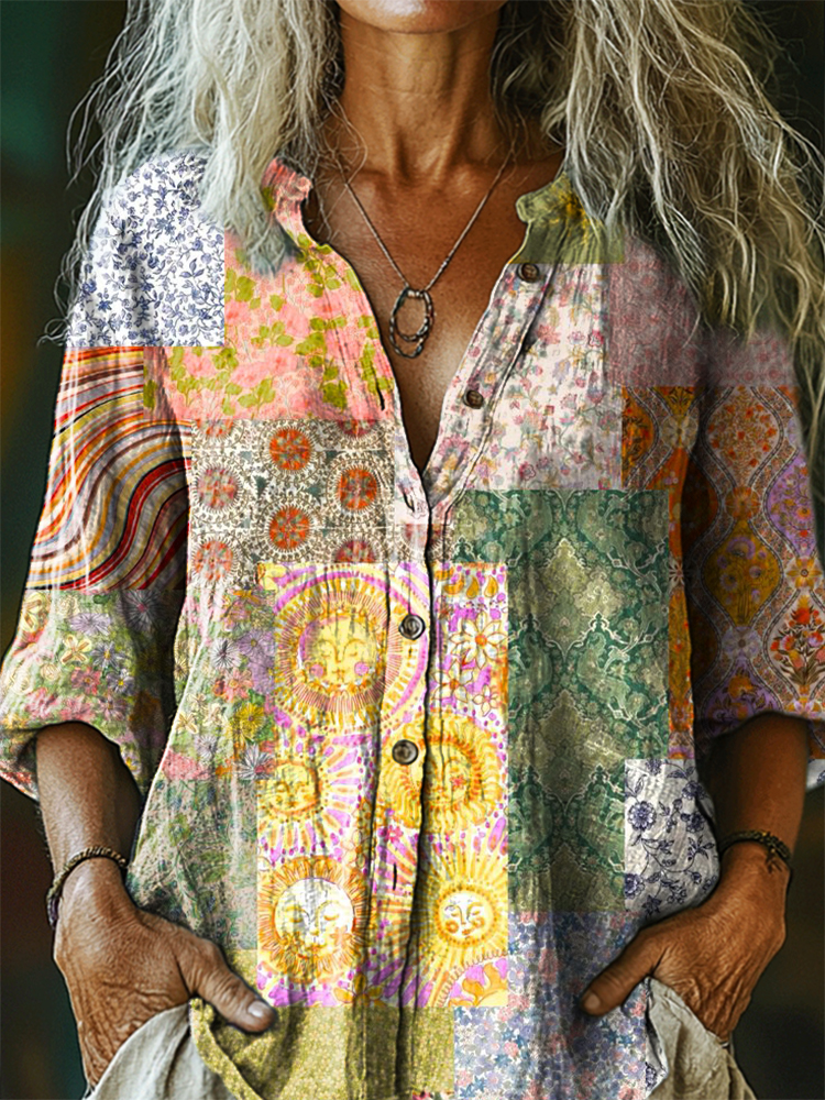 Women's Vintage Floral Art Print Casual Cotton And Linen Shirt