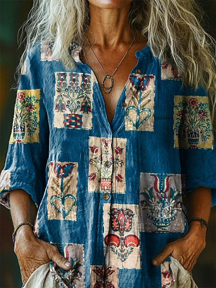 Women's Vintage Floral Art Print Casual Cotton And Linen Shirt