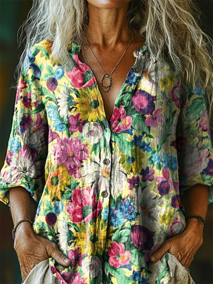 Women's Vintage Floral Art Print Casual Cotton Linen Shirt