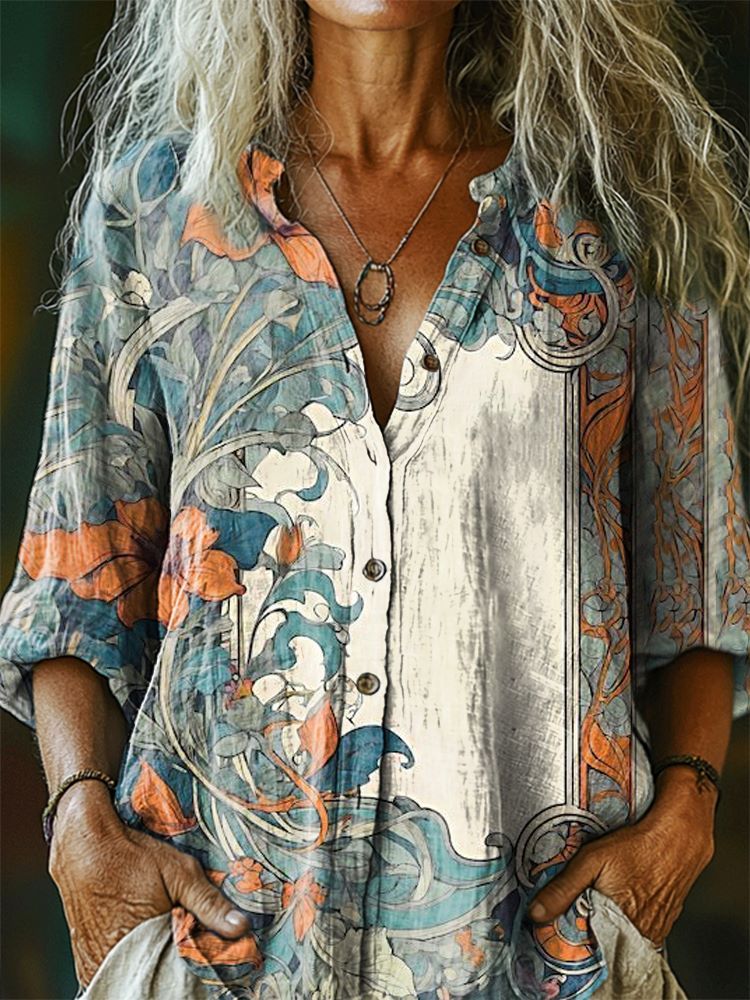 Women's Vintage Floral Tattoo Pattern Art Print Casual Cotton Linen Shirt