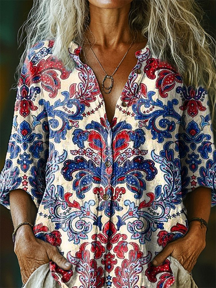 Women's Vintage Floral Tattoo Pattern Art Print Casual Cotton Linen Shirt
