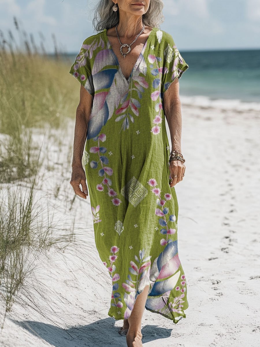 Women's Vintage Flower Art Print Pocket Cotton Dress