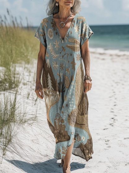 Women's Vintage Flower Art Print Pocket Cotton Dress